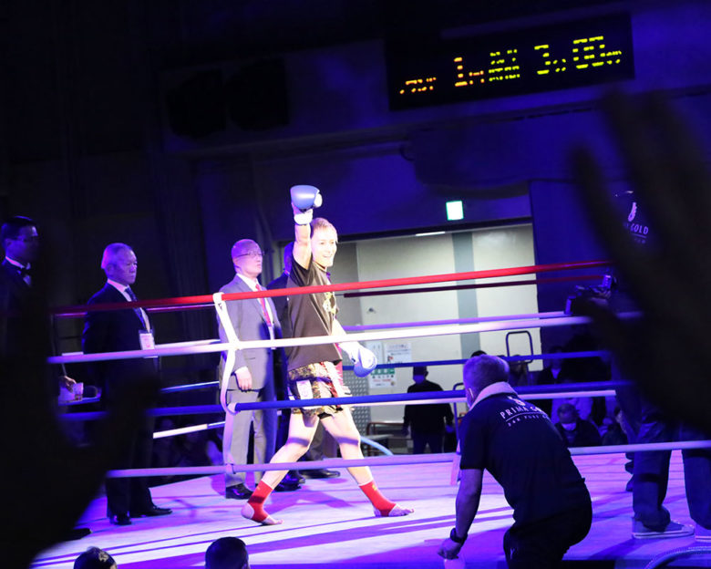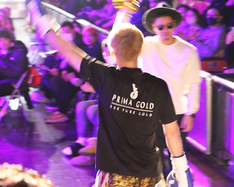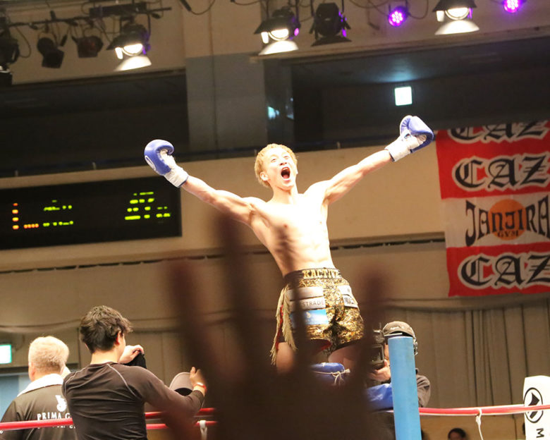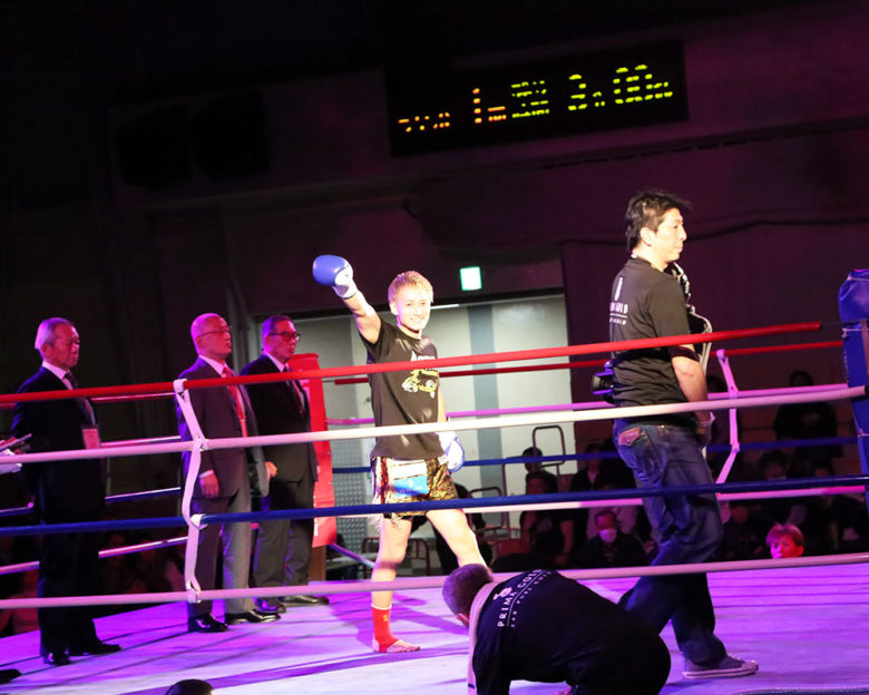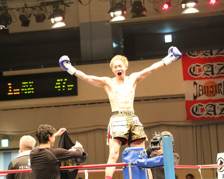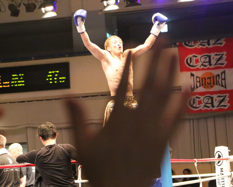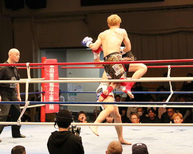 タイミングを計って出した飛びヒザ蹴りが棚橋選手の顔面にヒットし、そのまま起き上がることができずKO勝利!わずか1分30秒でのKOで太一選手が王座決定戦に勝ちチャンピオンになりました。