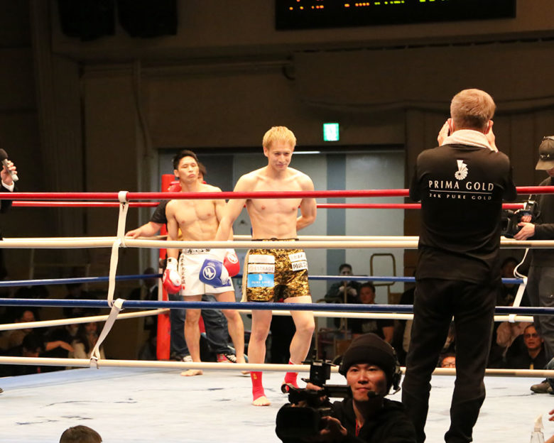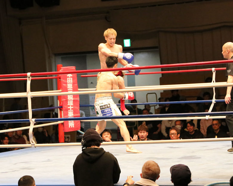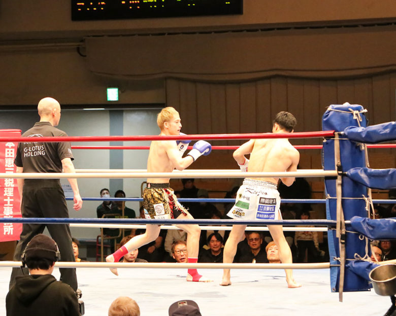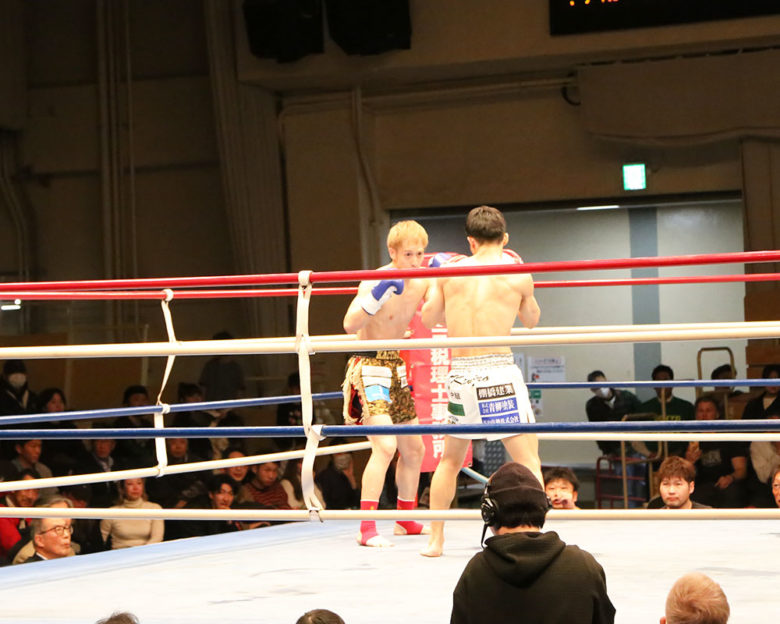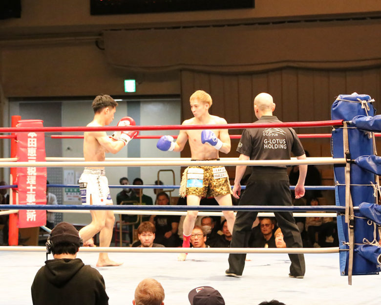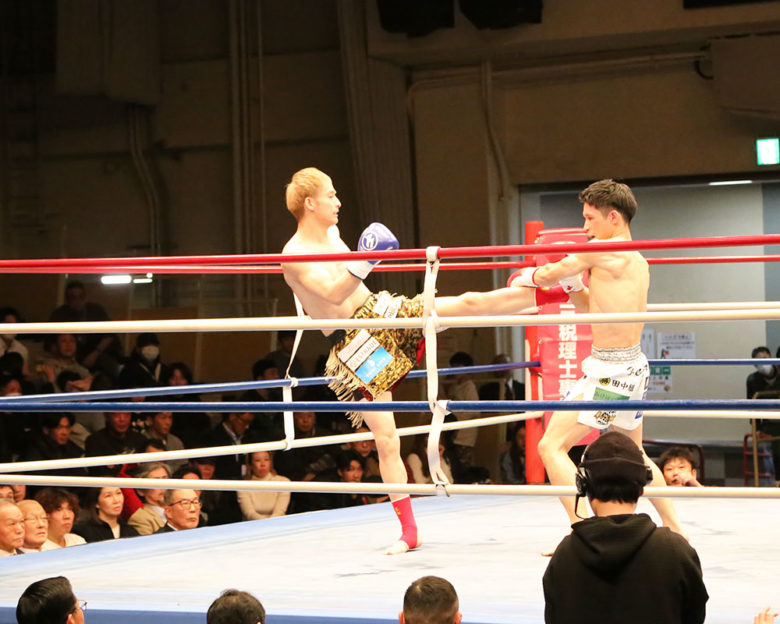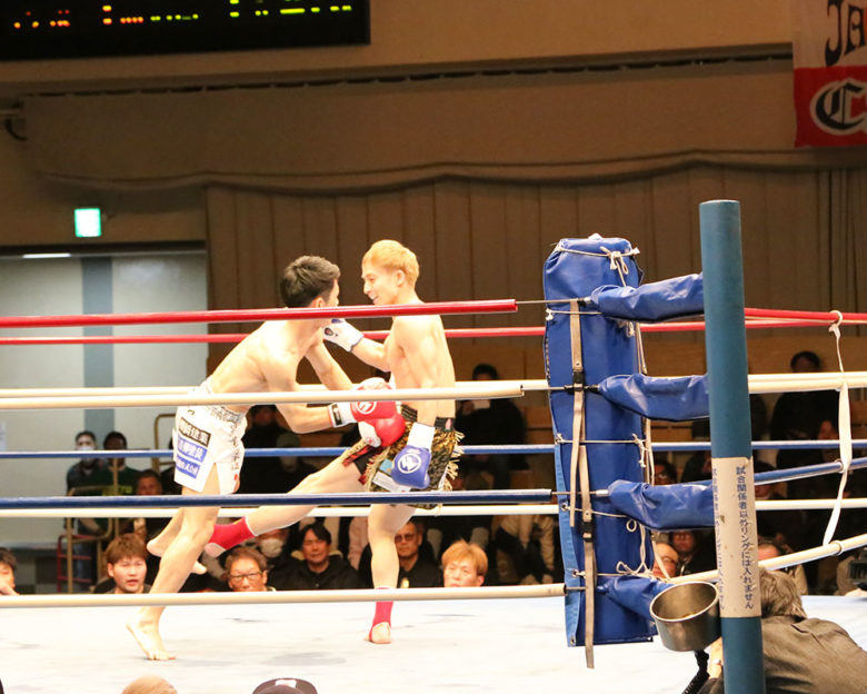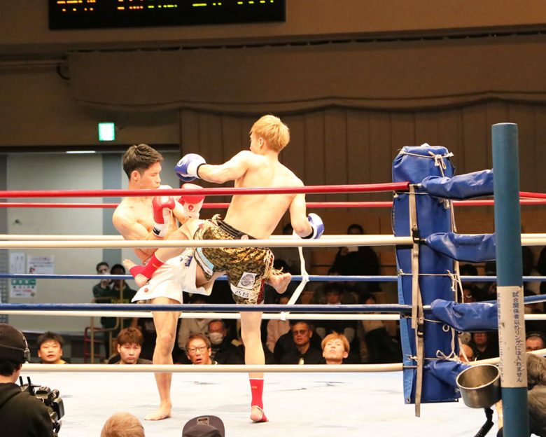タフで激しい打ち合いができる棚橋選手に対して太一選手は距離をとってジャブ、ローで様子見。